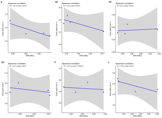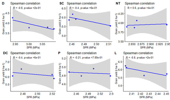 Spearman correlation between SPR and wheat grain yield. The following letters represent tillage treatments: D—disking, SC—shallow cultivation, NT—no-tillage, DC—deep cultivation, P—plowing, L—loosening.