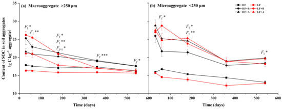 The content of soil organic carbon (SOC) in soil aggregates all gradually decreased during incubation for the treatments with residue addition (p < 0.05) (Table S1), and the SOC of the microaggregates was higher than that of the macroaggregates almost all the time during the residue-addition treatments (Figure 1). Residue addition increased SOC for both the macro- and microaggregates. However, the increase in the range of SOC for the microaggregates was larger than that of the macroaggregates during the incubation period. Ultimately, the microaggregate SOC increased 46.4% on average compared to the control treatment (Figure 1b), while the macroaggregates exhibited only an 8.5% increase in the HF soils, with no increase in the LF soils (Figure 1a). The SOC content of treatments with aboveground residue addition in the macroaggregates was significantly lower than that of belowground residue-addition treatments in the first 180 days of incubation, but the influence of soil fertility was marginal during the period (Figure 1a). However, following that, the SOC concentration in HF soils was significantly larger than that in LF soils (p < 0.05), while there was no significant difference between the treatments of residue types (p > 0.05). The results showed that there was an obvious transformation effect of treatment from the residue type to soil fertility on SOC with time in the macroaggregates.