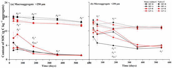 Notably, the native C in the macroaggregates of the HF soil decreased slightly but significantly after day 180, while no significant change was observed for the LF soil and for the microaggregates of both LF and HF (Figure 2). Moreover, there should probably be limited C transfer between the micro- and macroaggregates that led to the decrease in native C in the macroaggregates of the HF soil, based on the results showing that no large increase in native C was found in the microaggregates (Figure 2b). The results suggested that there might be a mild priming effect occurring in and constrained to the macroaggregates in HF soil during the later stages of residue decomposition. Mo et al. [52] also believed that differentiation of priming effects happened among soil aggregates based on their 13C-labelling laboratory study. Other studies also reported that the addition of exogenous substances to the macroaggregates resulted in a higher priming effect than that of the microaggregates [53]. Researchers mainly attributed the results to the greater level of protection on organic C provided by the microaggregates, thus slowing down the mineralization of native C [54]. These results are in accordance with our conclusion of a larger C fixation capacity in the microaggregates discussed above. In addition, the high fertility of soil provided the driving force for the priming effect with a larger microbial biomass and higher enzyme activities [55,56]. However, soil microorganisms should initially prefer to utilize newly added unstable organic C substrates compared to the native C of soil [57] (also see Figure 2a). As unstable exogenous substrates were gradually consumed, decomposing native C was encouraged because the increased biomass of soil microorganisms needed replenishment to maintain their biomass [58,59]. Above all, the study indicated that the priming effect induced by the exogenous organic C might more easily happen in the macroaggregates of soil with sufficient native organic C.