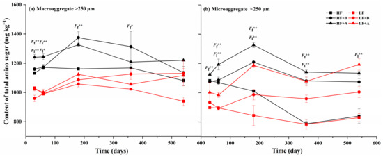 During the incubation period, the amino sugar content fluctuated with time generally in an upside-down “V” shape and was significantly affected by the soil fertility level and type of maize residue addition (Figure 3). The amino sugar content gradually increased before day 180 for almost all treatments with residue addition. In the macroaggregates, the HF and LF treatments increased by an average of 12.6% and 11.6%, respectively, and by an average of 15.3% and 12.3% in the microaggregates, respectively. This content subsequently declined to match the HF treatment at the end of the incubation period (on average, 1148 mg kg−1), but were generally maintained at day 180 for the LF treatments. Overall, the amino sugar content was significantly higher in the HF soil than in the LF soil (p < 0.05). It was also significantly greater under the treatments with aboveground residue addition than those with belowground residue addition, except for day 540 (Figure 3). At the end of the incubation period, the amino sugar content of residue-addition treatments was significantly greater than that of the treatments without residue addition in the microaggregates (p < 0.05), while there was no significant difference between them in the macroaggregates (p > 0.05).