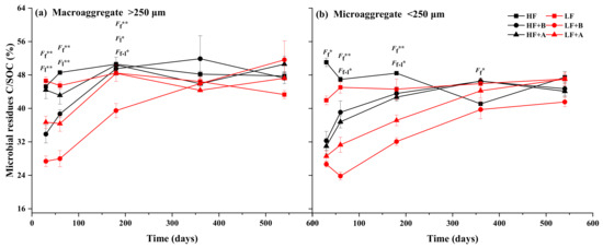 Finally, there was 19.63–22.9% MDC remaining for the macroaggregates and 55.6–86.96% MDC for the microaggregates (Figure 2), both with a tiny discrepancy between the HF and LF soils. In addition, the residual MDC remained unchanged in the soil from day 360 to the end of the experiment, which could be considered a final increment of the SOC pool. Accordingly, soil fertility levels did not affect the C fixation of aggregates, which is inconsistent with our second hypothesis. Finally, the MDC could be fixed by soil due to the following reasons: Firstly, the remaining MDC was chemically resistant to soil microorganisms [48], or it was transformed by soil microorganisms into a chemically resistant form, i.e., the microbial residues [36,49]. Secondly, this part of the MDC was protected by the strong combination with mineral particles [37,50]. In this experiment, the results showed that there was no significant difference in MRC/SOC between residue-addition treatments and their control in either the macro- or microaggregates of either the HF or LF soils at the end of incubation (Figure 4). This indicates that there must have been a similar rate of microbial residue in the fixed MDC to maintain the equivalence of MRC/SOC between residue-addition treatments and their control (41.56–51.63%, Figure 4). Accordingly, there was almost half of the fixed MDC sequestrated in soil through microbial residue. In addition, the rest of the fixed MDC should probably be minerally protected as plant residue rather than the chemically resistant MDC, considering that there was no difference in the fixed MDC between the residue-addition treatments with different chemical compositions. In a word, the fertility of soil could manipulate the sequestrating course of exogenous organic C in the short term but had no influence on the long term. The result was in accordance with Xu et al. [51], who found that, after 500 days of experimentation, the mineralization of exogenous C was essentially the same in both low- and high-fertility soils.
