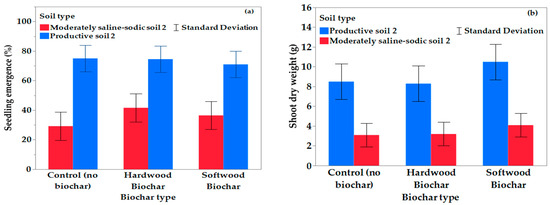 Effect of biochar on enhancing seedling emergence and growth in non-saline and saline–sodic soils. (a) Percentage seedling emergence increased when either softwood or hardwood was added to moderately saline–sodic soil 2 compared to productive soil 2. (b) No difference in shoot dry weight (g) with biochar addition to either productive soil 2 or moderately saline–sodic soil 2.