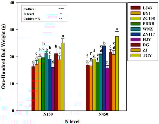 Both cultivar and nitrogen level significantly influenced one-hundred-bud weight, with a significant interaction effect (Figure 2). Under the N150 level, the averaged one-hundred-bud weight ranked as HJY < LJ43 < BY1 < ZJ < ZN117 < ZC108 < FDDB < DG < WNZ < TGY. TGY exhibited the highest average one-hundred-bud weight at 25.08 g, which was significantly greater than that of the other nine cultivars, and HJY showed the lowest with the average weight of 16.00 g. However, in the N450 treatment, the averaged one-hundred-bud weight showed a different order from that under N150, with HJY < BY1 < LJ43 < FDDB < ZC108 < ZJ < WNZ < DG < ZN117 < TGY. Cultivar TGY still had the highest value by 27.49 g, while HJY showed the lowest, with a mean value of 15.87 g.