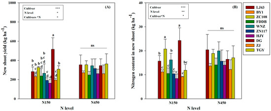Cultivar and nitrogen level both significantly affected the new shoot yield, and with a significant interaction effect (Figure 3A). Under N150 treatment, DG exhibited the highest new shoot yield, which was significantly (p < 0.05) higher than that of the other nine tea varieties. The average new shoot yield in response to N150 treatment for each cultivar ranked in ascending order as HJY, ZJ, ZN117, BY1, FDDB, WNZ, LJ43, TGY, ZC108, and DG. Under N450, TGY exhibited the highest average tea tender shoot biomass, followed by ZC108, LJ43, DG, WNZ, ZN117, BY1, ZJ, and HJY, while FDDB recorded the lowest average new shoot yield (Figure 3A). However, there was no significant effect in the new shoot yield across the ten tea varieties.