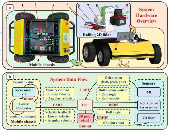 System overview. (a) System hardware overview. 1. Servo motors (for driving wheels). 2. Lower computer. 3. Battery (48 V). 4. Voltage conversion modules. 5. DC motor driver. 6. Inertial Measurement Unit (IMU). 7. DC motor. 8. Servo controller (built-in magnetic encoder). 9. Two-dimensional lidar. 10. Industrial Personal Computer (IPC). All sensors and mechanical structures in this study follow a right-handed Cartesian coordinate system. Or-xyz represents the robot reference coordinate system, where the x-axis points in the direction of the robot’s forward motion, the y-axis points to the left of the robot’s forward direction, the z-axis points directly upwards from the robot, and the origin of this coordinate system is the projection point of the robot’s geometric center within the x-Or-y plane onto the ground. Ol-xyz is the reference coordinate system of 2D point clouds, whose origin is the center of the laser emitter, whose x-axis aligns with the optical axis of the 2D lidar. O3d-xyz denotes the reference coordinate system of constructed 3D point clouds, whose origin coincides with the origin of Ol-xyz, whose axes align with axes of Or-xyz and Oi-xyz (IMU coordinate system) (b) System data flow.