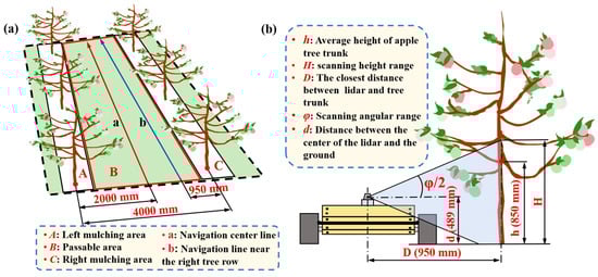 The selection of roll motion parameters for lidar not only needs to consider their impact on the quality of the 3D point cloud but also needs to be combined with the structural parameters of the orchard to ensure that the system can operate normally in the orchard environment. Therefore, this study surveyed the structural parameters of the Modern Apple Orchard of the National Apple Improvement Center located in Yangling District, Shaanxi Province, China. Figure 3a illustrates the inter-row structure of the orchard. The average row spacing between trees is approximately 4 m, and the plant spacing is about 1 m. The entire area between rows can be divided into three zones: A, B, and C. Zones A and C are the mulching areas at the base of the trees, which are inaccessible to robots, while zone B serves as the operational area for robots, allowing safe passage. Lines a and b are schematic navigation lines to guide the robot to travel along the centerline of the tree row and near one side of the tree row. Due to the constraints imposed by the mulching areas, the minimum distance that can be maintained between the center of the lidar and the single-sided tree row is approximately 0.95 m.