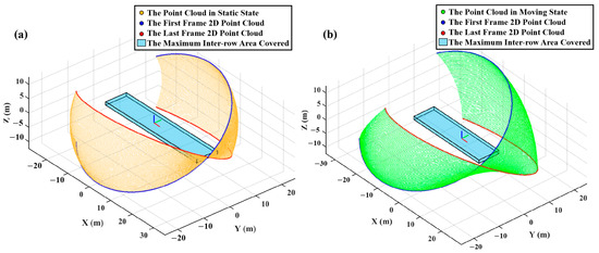 Schematic diagram of the maximum coverage range of the 3D point cloud and the maximum area that the tree row can be covered under static and moving states. (a) The maximum area covered by the point cloud generated by the system in a stationary state during one roll cycle, as well as the maximum area within the point cloud that can include the trunk area of fruit trees in the current tree row. (b) The maximum area covered by the point cloud generated by the system in a moving state during one roll cycle, as well as the maximum area within the point cloud that can include the trunk area of fruit trees in the current tree row.