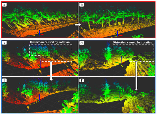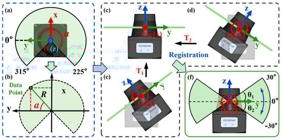 Subsequently, as shown in Figure 6c–f, the 2D point cloud in the lidar coordinate system Ol-xyz is registered to the 3D point cloud reference coordinate system O3d-xyz. In the ideal state where the motor output axis coincides with the lidar optical axis, the angle (θi) fed back by the motor encoder is the rolling angle of Ol-xyz around the x-axis of O3d-xyz. Therefore, the coordinates of 3D point clouds () can be obtained through Equation (13):