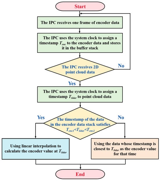 However, since the lidar and encoder employ distinct clock control sources, and their data transmission frequencies are different at 30 Hz and 180 Hz, respectively, a software-level time synchronization is conducted to ensure that the lidar data syncs with the roll angle fed back by the encoder when projecting it into the 3D space. The specific implementation process is illustrated in Figure 7. Finally, the system is calibrated using the method proposed by Hatem Alismail and Brett Browning [28] to eliminate the point cloud distortion caused by assembly errors.