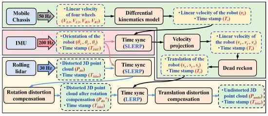 When the system is in a motion state, the 3D point cloud calculated directly by Equation (13) will show severe distortion in a relatively long rolling cycle without knowing the system motion state. Therefore, real-time accurate system motion state estimation is of great significance for compensating for the motion distortion of the 3D point cloud and ensuring the safety and stability of autonomous navigation. A combination of wheel odometry and IMU was employed to achieve 6 Degree of Freedom (6-DOF) motion state estimation for the rolling lidar system to eliminate the point cloud motion distortion. In this study, the reference coordinate system for 3D point clouds is set as O3d-xyz, and all processing related to 3D point clouds is completed within this reference coordinate system. Therefore, the core steps for estimating the system’s motion state include, firstly, establishing the initial state coordinate system O3d-xyz at time zero as the global coordinate system, and secondly, obtaining the real-time coordinate transformation of O3d-xyz relative to this global coordinate system after time zero. The pipeline of 3D point cloud motion distortion compensation is shown in Figure 8.