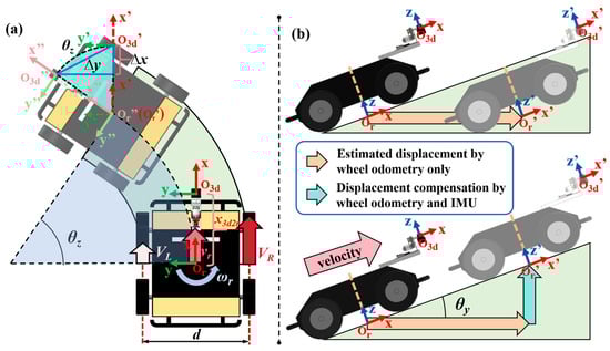 Schematic diagram of 6-DOF pose estimation based on IMU and wheel odometry. (a) Principle of wheel odometry based on differential model and schematic of the additional translation [∆x, ∆y, 0]T between O3d′-x′y′z′ and O3d″-x″y″z″ caused by spatial offset x3d2r between Or-xyz and O3d-xyz in the x-O-y plane. (b) Schematic of the displacement along the z-axis calculated by combining wheel odometry and IMU.