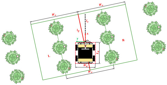 Subsequently, a point cloud filtering method is proposed, as illustrated in Figure 11, to ensure that the filtered 3D point cloud can fully cover the information of the current row, and filter out point cloud data from the vehicle body and adjacent tree rows, effectively distinguishing between the left and right tree row point clouds. Firstly, taking O3d-xyz as the reference coordinate system, based on the geometric dimensions of the robot, a pass-through filter is employed to remove the point cloud of the vehicle body. Secondly, addressing the issue where the rapid rotation of the robot within a short period leads to misalignment between the tree row distribution and the robot travel direction, making it difficult to filter out adjacent tree row point clouds via pass-through filtering and distinguish between left and right point clouds, this study utilizes the tree row centerline lo detected from the previous frame point clouds, combined with robot motion state, to predict parameters of centerline lp for the current frame’s point cloud. Assuming that the position and direction of a straight line can be expressed using the coordinates of two points p1(0, b) and p2(1, k + b) on the line, lo can be represented by (0, bo) and (1, ko + bo), where ko and bo are the slope and intercept of lo, respectively. The line parameters of lp can be obtained using Equation (23):