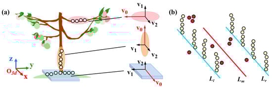 Trunk point extraction and navigation line detection. (a) Point cloud local geometric feature extraction, where (v0, v1, v2) are the first three eigenvectors of the local point cluster. (b) Navigation line fitting based on RANSAC. Red points represent the outliers, while yellow points are the inliers. Ll, Lm, and Lr represent the left tree row line, the tree row midline, and the right tree row line, respectively.