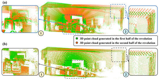 Comparison results before and after internal parameter calibration. (a) The 3D point cloud of the laboratory generated in the first and the second half of the revolution before calibration. 1. The enlarged view of the uncalibrated 3D point cloud of the screen and the desk. 2. The enlarged view of the uncalibrated 3D point cloud of the corner of the walls. (b) The 3D point cloud of the laboratory generated in the first and the second half of the revolution after calibration. 1. The enlarged view of the calibrated 3D point cloud of the screen and the desk. 2. The enlarged view of the calibrated 3D point cloud of the corner of walls.