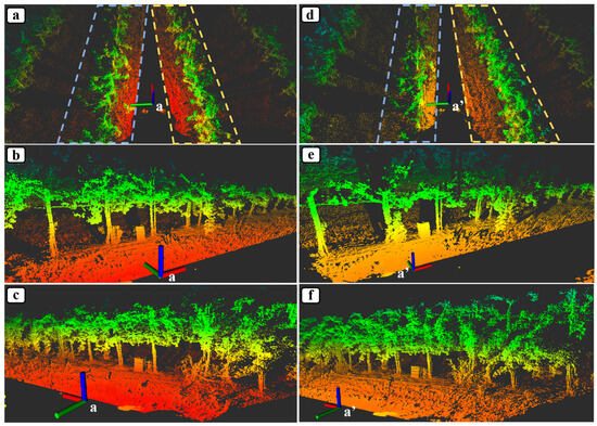 The 3D point cloud obtained by the rolling 2D lidar system under a static state is shown in Figure 15. Figure 15a is a top view of the orchard 3D point cloud obtained when the robot is placed at point a. The left tree row point cloud detail in the blue dashed box is shown in Figure 15b, while its right counterpart in the yellow dashed box is shown in Figure 15c. Owing to the similar distance between the lidar and two tree rows, point clouds acquired from both sides have almost the same density. Furthermore, it can be demonstrated that the point cloud has sufficient vertical FoV to fully cover the trunk areas and can also clearly display the geometric details of fruit tree trunks. Additionally, Figure 15d–f depict the top view and enlarged view of the left and right tree row 3D point cloud data collected by the robot at point a’. Due to the proximity of the lidar system to the left tree row and its inherent characteristics of generating dense point clouds with narrow vertical coverage in close proximity and sparse point clouds with wide vertical coverage at greater distances, it is evident that the vertical coverage of the fruit tree trunk in Figure 15e is narrower than that in Figure 15f. Furthermore, the point cloud density in Figure 15f is notably lower. Despite these differences, both Figure 15e,f demonstrate an adequate quantity, completeness, and clarity of the fruit tree trunk point clouds for autonomous navigation, thereby reinforcing the validity of the system parameter design outlined in Section 2.2.