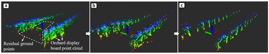 In this study, the same outdoor test as described in Section 3.1.1 was employed to control the robot to travel along the centerline from the beginning to the end of the row, with an analysis of the effectiveness of point cloud trunk extraction and navigation line fitting during the movement. Taking Figure 18 as an example, (a) depicts the point clouds of the left and right tree rows extracted by the point cloud filtering module. It can be observed that the point clouds still contain a significant amount of noise points beyond the tree trunks, such as residual ground points, orchard display boards, and numerous branches and leaves. By comparing (a) and (b), it can be seen that after segmenting the point clouds using their local geometric features, the remaining ground points display board point clouds, and some of the disorderly lateral branches of the fruit trees are removed, making the point clouds of the trunk area clearer and more prominent. However, there are still many noise point clouds from the canopy and lateral branch areas. By comparing (b) and (c), it can be observed that when using RANSAC for tree row line fitting, the geometric constraints based on the linear distribution of the tree rows enable RANSAC to further extract the point clouds of the trunk area during the process of selecting inliers.