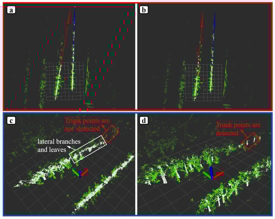 The results of tree row detection are shown in Figure 19. From (a), it can be observed that directly applying RANSAC line fitting to the left and right tree row point clouds results in significant influence from noise data within the tree row point clouds, leading to extracted tree row lines that do not align with the actual tree row distribution, and the left and right lines are severely non-parallel. However, if the point clouds are initially constrained using local geometric features to remove most of the excess noise data, followed by RANSAC for line fitting, better tree-row-detection results can be obtained, as shown in (b). The left and right tree rows are not only parallel but also highly consistent with the actual tree row distribution. Further analysis of the inliers extracted by RANSAC in (a) reveals that, as seen in (c), when the side branches and leaves in the tree rows are very dense and the point cloud number and density exceed that of the trunk, RANSAC tends to extract these parts of the point cloud as inliers, making it difficult to extract feature points that truly represent the tree row position and direction. In contrast, (d) first constrains the point cloud data in the z-axis direction using local geometric features, screening out candidates that are more likely to be from the tree trunk. Subsequently, RANSAC is used to constrain the point cloud along the tree row direction, further extracting potential trunk point clouds of the fruit trees, which can more stably represent the tree rows.