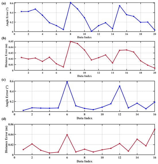 Results of detected navigation line accuracy verification. (a) Navigation line angle error at a moving speed of 0.2 m/s. (b) Navigation line distance error at a moving speed of 0.2 m/s. (c) Navigation line angle error at a moving speed of 0.5 m/s. (d) Navigation line distance error at a moving speed of 0.5 m/s.