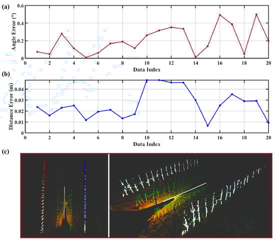 Tree rows to the left of the current left tree row and the right of the current right tree row were extracted to simulate a working scenario with an average tree row width of 12 m (greater than the row width of most modern orchards). Subsequently, we used the same method described in Section 3.2.2 to extract and verify the accuracy of the navigation line, thereby validating the generalization of the system in orchard scenarios with wide tree rows. Figure 22a,b show the evaluation results of navigation-line-detection accuracy in the scenario with a 12 m row width. The average angular error is 0.205°, the average distance error is 0.026 m, the maximum angular error does not exceed 0.5°, and the maximum distance error does not exceed 0.05 m. These results are comparable to the navigation line accuracy obtained in the scenario with a 4 m row width, ensuring the perception accuracy for guidance between rows. Figure 22c shows the results of navigation line fitting and tree trunk feature point extraction. It can be seen that as the row spacing widens, the rolling 2D lidar is able to obtain more fruit tree point clouds in the vertical direction while also making the point clouds of the left and right tree rows become sparser. Nevertheless, a vertical resolution of 0.25° is sufficient to provide adequate geometric detail information, enabling the system to extract the main trunk point clouds of the fruit trees and use them to fit a high-accuracy navigation line.