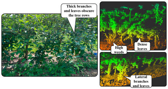 Nowadays, modern orchards have become the mainstream mode of fruit cultivation and production, where trees are planted in straight and parallel rows, forming a semi-structured workspace [3]. Considering this semi-structured tree cultivation, autonomous navigation in orchards can be simply described as the robot traveling from the beginning to the end of the tree row and performing a U-turn to the next tree row, repeating this process until it covers the entire workspace [4]. This working mode requires sensors to perceive and extract the tree row information for accurate positioning and stable guidance in orchards with thick canopies, dense weeds, and varying illuminations. The Global Navigation Satellite System (GNSS) combined with Real-Time Kinematic (RTK) technology achieves good performance in autonomous navigation in farms and fields [5]. Nevertheless, the interference of fruit tree branches and dense canopies in orchards can lead to unstable or even lost satellite signals, thereby affecting the reliability and safety of autonomous navigation [6]. In contrast, lidar is not affected by signal interference because it does not require external signals to obtain positioning information [7]. Furthermore, lidar is insensitive to changing illumination, which most optical sensors suffer from [8,9,10,11].