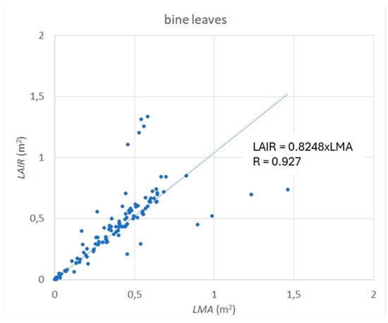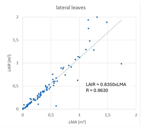 Relationships between lateral leaf areas determined using infrared imaging (LAIR) and the gravimetric method (LAM) from 2019 to 2021. Statistically significant relationships between LAIR and LMA is at the 95.0% confidence level.