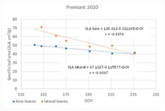 For the period 2019–2021, Figure 2 and Figure 3 show correlations via infrared imaging (LAIR) and the mass/gravimetric method (LAM) for measuring leaf area on bine and lateral leaves. The high values of the correlation coefficients of 0.96 and 0.93 prove that both methods provide comparable values. The gravimetric method further showed that the specific leaf area of bine and lateral leaves decreases in the course of vegetation. This decrease is significantly more pronounced in lateral leaves (Figure 4). Bine leaves have a lower specific area than lateral ones. It linearly decreases throughout the growing season (May–August). Bine leaves have a specific leaf area of approximately 50 cm2 g−1 at the start of the growing season, which decreases to 40–42 cm2 g−1 by harvest. The range of the specific area of lateral leaves is much wider (40–70 cm2 g−1), probably due to their greater shape and size variability. The most laborious step for both methods is the complete defoliation of the hop bine, followed by the separation of the bine and lateral leaves by height floors. Accurate data obtained by destructive methods can serve as comparative values in the development of non-destructive methods; for example, using unmanned aerial vehicles (UAV) [36]. The advantage of non-destructive methods is the possibility of monitoring leaf area development during the ontogeny of plants in large areas of hop yards [37].