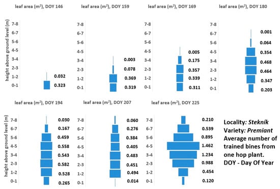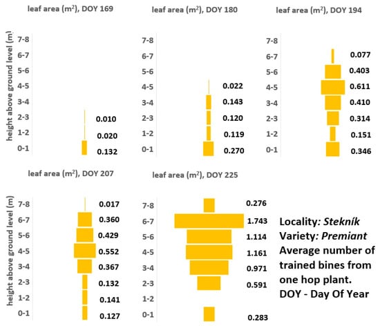 Limited research exists on the hop leaf area, particularly in organic farming systems. Sachl and Kopecký [29] describe the mass distribution of cones and leaves in the height profile of a hop garden. The largest mass proportion of cones in the range of 84–98% of the total yield was found in the height levels between 4 and 7 m (top of the trellis), with the share of leaves being in the range of 61–98%. The spatial distribution of the leaves and cones on the plant also affects the light intensity inside the hop garden [29,30]. Sunlit leaves show an average of 60% higher stomatal conductance than shaded ones. Leaves illuminated by more than 75% are characterized by the highest intensity of photosynthesis [9]. The distribution of the leaves and size of the LA can also affect irrigation efficiency, when sprinklers are placed at the top of the trellis [31,32]. Hniličková [33] studied the development of leaf area of irrigated and non-irrigated plants of the Czech hop variety Saaz. The LA values were in the range of 2.9–4.7 m2. Irrigated plants had 7–37% more leaf area than plants dependent only on rainwater.