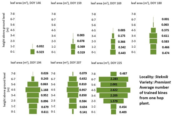 Analyses of the spatial distribution of the hop plant’s leaf surface using infrared imaging (LAIR) and mass methods confirmed spatiotemporal changes during vegetation. The dynamics of the development of leaf area on the hop plant in time and space are basically the same every year. A typical course of the increase in leaf area during the 2021 growing season is shown in Figure 5, Figure 6 and Figure 7. Bine leaves (Figure 5) are primarily involved in the formation of the hop plant leaf surface, which is dominant until 160 DOY. Hops’ growth in length is completed when the plant enters the generative phase (blooming and cones formation). With the development of lateral shoots, lateral leaves are gradually formed (Figure 6). The leaf area, especially small lateral leaves, continues to grow. Their total area is larger than that of bine leaves towards the end of the vegetation season, especially when the plant enters the phase of cones formation. Change in the proportion of the area represented by bine and lateral leaves modifies the spatial distribution of the total area of leaves on the plant (Figure 7).