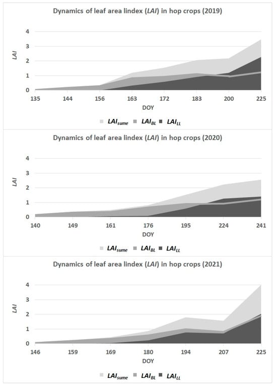 The average value of LAI for the height profiles of the hop plants and the entire growth in the evaluated dates from 2019 to 2021 was determined for the average number of trained bines per plant (4) and the ground area corresponding to one hop plant (3 m2). Day of year (DOY) values were used to express temporal dynamics.