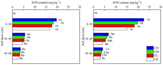 Figure 1. SON content in paddy soils under different CMV application rates along depth gradients. Note: B, background soil; M, maturity stage. Lowercase letters indicate the significance of differences between treatments, while uppercase letters indicate the significance of differences between soil layers.
