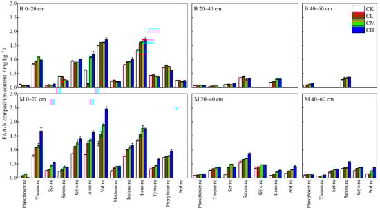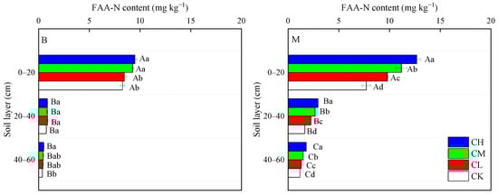 Figure 3. FAA-N composition in paddy soils under different CMV application rates along depth gradients. Note: B, background soil; M, maturity stage.