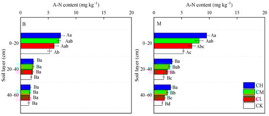 Figure 4. A-N content in paddy soils under different CMV application rates along depth gradients. Note: B, background soil; M, maturity stage. Lowercase letters indicate the significance of differences between treatments, while uppercase letters indicate the significance of differences between soil layers.
