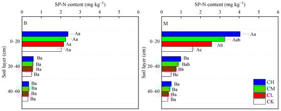 Figure 5. SP-N content in paddy soils under different CMV application rates along depth gradients. Note: B, background soil; M, maturity stage. Lowercase letters indicate the significance of differences between treatments, while uppercase letters indicate the significance of differences between soil layers.