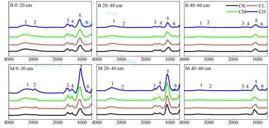 Figure 6. FTIR spectroscopy of SON extracts in paddy soils under different CMV application rates along depth gradients. Note: B, background soil; M, maturity stage. Note: Peak 1 (3400 cm−1): -OH stretching (carbohydrates, carboxylic acids, phenols, alcohols) and N-H stretching (amides); Peak 2 (2900 cm−1): C-H stretching (lipids); Peak 3 (1630-1650 cm−1): C=O stretching (aromatic rings in lignin and amides, amide I band); Peak 4 (1400–1460 cm−1): Lignin, aliphatics, and C-N stretching (amide III band); Peak 5 (1000–1100 cm−1): C-O stretching (carbohydrates, polysaccharides); Peak 6 (795 cm−1): Carbonate group absorption.