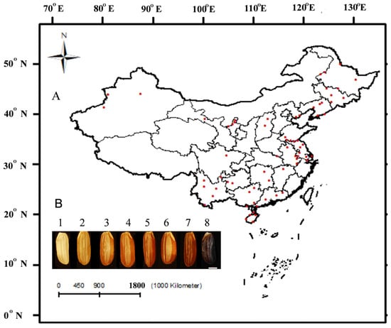Sampling sites of 69 weedy rice populations, including 202 strains across China, and the caryopsis color of weedy rice. Note: (A) The red dots on the map represent the 69 sample sites. (B) The caryopsis color of weedy rice. The scale value is 2 mm. Samples (1–8) are from Jiangxi Nanchang (WRL-5201), Yunnan Xishuangbanna (WRL-8553), Yunnan Xishuangbanna (WRL-8554), Hunan Chenzhou (WRL-8623), Anhui Xuancheng (WRL-8191), Guangdong Meizhou (WRL-7375), Guangdong Maoming (WRL-5425), and Jilin Songyuan (WRL-2906), respectively.