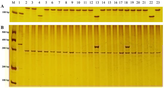Rc/Rd alleles of weedy rice strains using polyacrylamide gel electrophoresis. Note: (A) represents the Rc/rc alleles. The Rc allele fragment was 118 bp in size, but the rc allele was 104 bp in size. (B) represents the Rd/rd alleles. The Rdp-tagged Rd allele and the Rdp-tagged rd allele had a size of 294 bp and 346 bp, respectively. M. 500 bp DNA marker; 1. Nipponbare (control sample, rcrcrdrd); 2. Anhui maanshang (WRL-4661, RcRcRdRd); 3. Gansu zhangye (WRL-4320, RcRcRdRd); 4. Guangdong Zhaoqing (WRL-5164, rcrcRdRd); 5. Guangxi qinzhou (WRL-6454, RcRcRdRd); 6. Guizhou anshun (WRL-731, RcRcRdRd); 7. Hainan east (WRL-1531, RcRcRdRd); 8. Hebei Qinhuangdao (WRL-2943, RcRcRdRd); 9. Henan xinyang (WRL-4596, RcRcRdRd); 10. Heilongjiang qiqihar (WRL-1830, RcRcRdRd); 11. Hunan yiyang (WRL-1387, RcRcRdRd); 12. Jilin Tonghua (WRL-1940, RcRcRdRd); 13. Jiangsu yancheng (WRL-3171 rcrcRdrd); 14. Jiangxi nanchang (WRL-5200, RcRcRdRd); 15. Liaoning tieling (WRL-111, RcRcRdRd); 16. Ningxia shizuishan (WRL-3784, RcRcRdRd); 17. Shandong yutai (WRL-3483, RcRcRdRd); 18. Shanxi Taiyuan (WRL-4557, RcRcRdrd); 19. Shanghai Chongming (WRL-3552, RcRcRdRd); 20. Sichuan Chengdu (WRL-810, RcRcRdRd); 21. Xinjiang Aksu (WRL-3990, RcRcRdRd); 22. Yunnan Yuanjiang (WRL-7798, rcrcRdRd); 23. Zhejiang Jiaxing (WRL-6330, RcRcRdRd).
