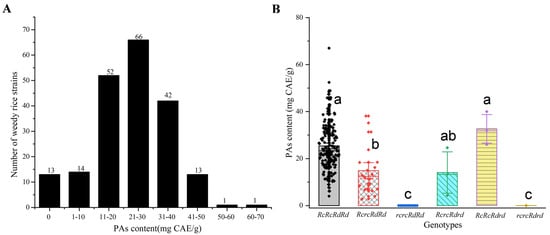 OPA content and Rc/Rd genotypes of the 202 weedy rice strains. Note: (A) Distribution of OPA content in the 202 weedy rice lines. The number on the black column represents the number of weedy rice strains in the content range. (B) OPA content in mature seeds of Rc/Rd genotypes detected in the 202 weedy rice strains. Dots represent the number of weedy rice strains. Vertical bars indicate the ± standard deviation of the mean. Lowercase letters (a, b, c) indicate significant differences (p < 0.05) according to Tukey’s HSD test.