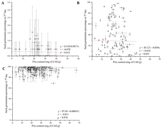 Pearson correlation between OPA content and seed germination percentage on the 2nd, 3rd, and 7th days. Note: (A) OPA content with seed germination percentage on the 2nd day; (B) OPA content with seed germination percentage on the 3rd day; (C) OPA content with seed germination percentage on the 7th day. Vertical bars indicate the ± standard deviation of the mean. Red line is trend line.