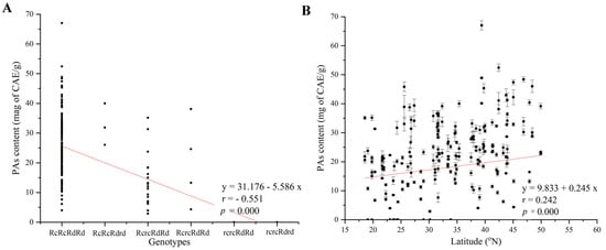 Pearson correlation between OPA content and Rc/Rd genotypes as well as latitude. Note: (A) OPA content with Rc/Rd genotypes; (B) OPA content with latitude. Vertical bars indicate ± the standard deviation of the mean. Red line is trend line.