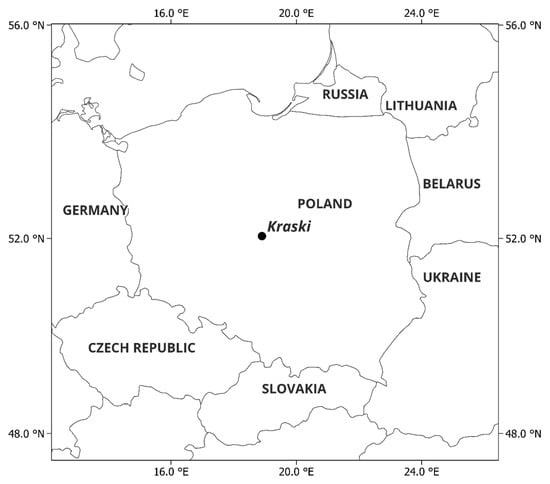 In the years 2023 and 2024, a field experiment was conducted, using maize as the grain, under commercial crop conditions in Kraski (52°2′42″ N, 18°54′6″ E), in Central Poland (Figure 1).
