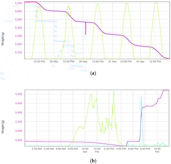 Water weight (g) (variation patterns (purple line) during a five-day measurement period (a) and within a day (b); solar radiation values are indicated by a green line color, and precipitation is indicated by a blue color.
