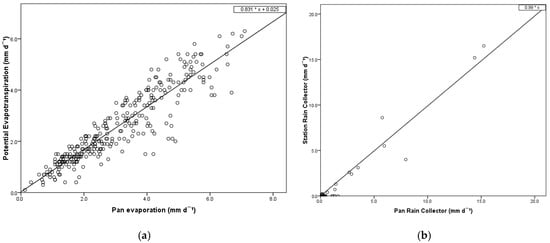 Potential evapotranspiration (ETO; mm d−1) vs. pan evaporation (EP; mm d−1) (a); pan precipitation (PR; mm d−1) vs. rain collector (SR; mm d−1) (b).