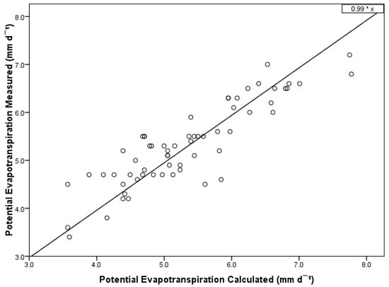 The results show that the ETOC could significantly predict ETOM (r2 = 0.99) with a slope of the regression line of 0.9. The mean ETOM was 5.344 (±0.10) mm and the mean ETOC was 5.342 (±0.12) mm. The mean air temperature during the validation period was 30 °C, i.e., 42.7% higher than the mean air temperature during the calibration period (17.2 °C). Similarly, the mean maximum solar radiation value was 808 W m−2, which was also 22% greater (630 W m−2) than in the calibration period, ensuring that the following model can be used under a wide range of climatic conditions: