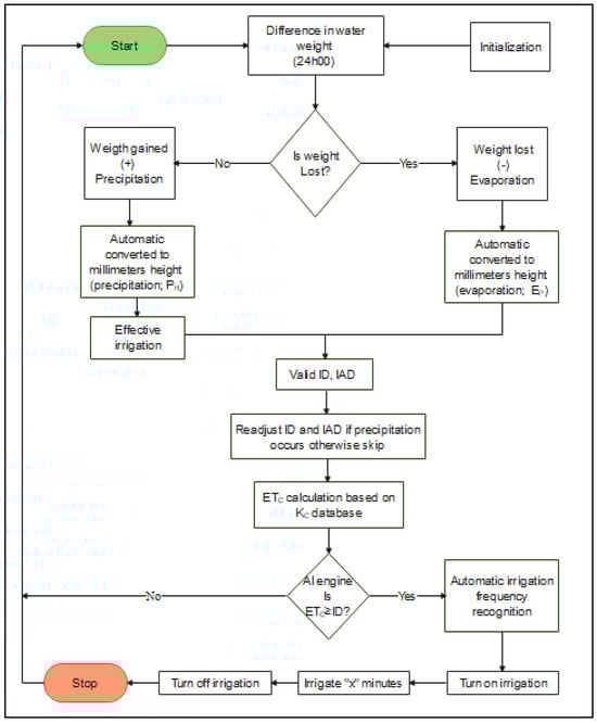 The final step of the procedure is the calculation of the irrigation frequency (Equation (6)). If the calculated daily ETC value is lower than the programmable ID value, then the algorithm should run the decision tree again from the first level. If the calculated accumulated ETC value since the last irrigation is equal to or greater than the ID value, then irrigation valves are set according to the preset time. After an “x” irrigation time, the irrigation stops to follow the same AI procedure for the next irrigation cycle.