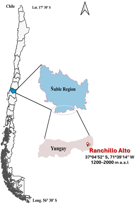 The study was conducted in Ranchillo Alto public property located in the foothills of the Ñuble region, Chile (37°04′52″ S, 71°39′14″ W; 1200–2000 m a.s.l.), covering approximately 635 ha (Figure 1). This property corresponds to a native forest that has undergone prolonged degradation mainly due to indiscriminate logging, overgrazing, and extraction of saw-quality timber and firewood (browsing, depredation). The foothills of the Ñuble region have a humid temperate Mediterranean climate with a marked winter season, and annual temperatures of 13.5 °C, but can exceed 25 °C in summer. The annual rainfall may exceed 3.000 mm in a normal year. Snowfall occurs mostly between May and September, reaching when there are low temperatures and frequent frosts. The soils are Andisols, “Santa Barbara” series (medial, amorphic, mesic Typic Haploxerands), and locally known as “trumaos” [23].