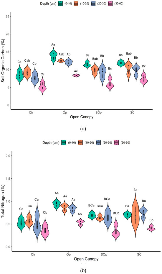 Violin plot of variables (a) organic carbon (%) and (b) total nitrogen as a function of the factors open canopy (Ctr: control; Op: open; SOp: semi-open; SC: semi-closed) and soil depth (0–10; 10–20; 20–30; and 30–60 cm). Uppercase letters indicate significant differences between open canopy levels, while lowercase letters indicate significant differences between soil depths. Differences were considered significant according to Tukey’s test (p < 0.05).