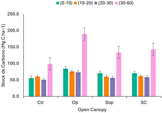 SOC stocks as a function of open canopy (Ctr: control; Op: open; SOp: semi-open; SC: semi-closed) and soil depth (0–10; 10–20; 20–30; and 30–60 cm). The error bars represent the standard deviation SD.