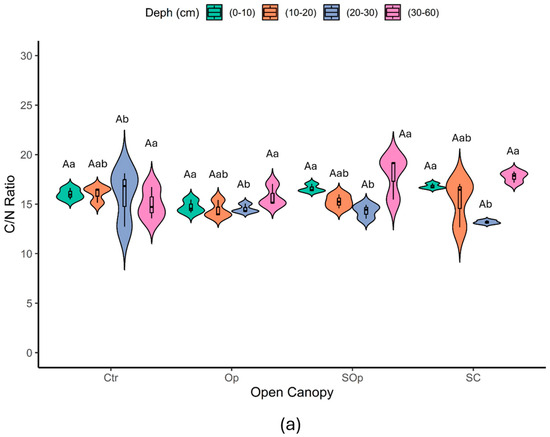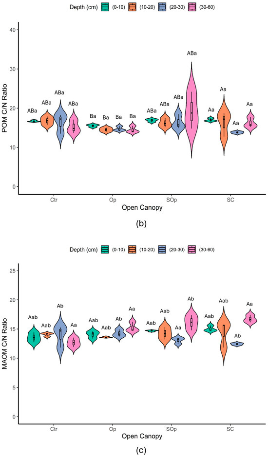 Violin plot of the variables: (a) C/N ratio, (b) POM C/N ratio, and (c) MAOM C/N ratio as a function of open canopy (Ctr: control; Op: open; SOp: semi-open; SC: semi-closed) and soil depth (0–10; 10–20; 20–30 and 30–60 cm). Uppercase letters indicate significant differences between open canopy levels, while lowercase letters indicate significant differences between soil depths. Differences were considered significant according to Tukey’s test (p < 0.05).