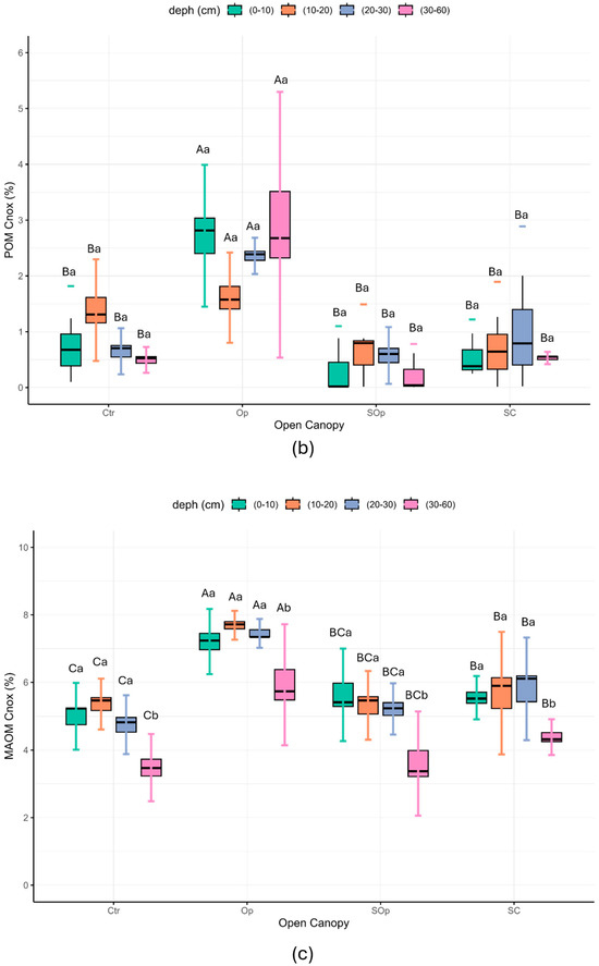 (a) Non-oxidizable carbon (Cnox %), (b) non-oxidizable carbon in particulate fraction (POM Cnox %), (c) non-oxidizable carbon in mineral fraction (MAOM Cnox %) as a function of open canopy (Ctr: control; Op: open; SOp: semi-open; SC: semi-closed) and soil depth (0–10; 10–20; 20–30 and 30–60 cm). Uppercase letters indicate significant differences between open canopy levels, while lowercase letters indicate significant differences between soil depths. Differences were considered significant according to Tukey’s test (p < 0.05). The box-and-whisker plot shows the distribution of the data in the box and the whiskers show the deviation. The line shows the mean of the data. The concentration of POM Cnox and MAOM Cnox showed significant differences depending on the open canopy conditions (p ≤ 0.05). In addition, the MAOM Cnox fraction also showed significant differences depending on the depth (p ≤ 0.05) (Figure 8b,c). In general, the values of POM Cnox and MAOM Cnox tend to be higher in the surface horizons (0–10 cm) and progressively decrease with depth, following a pattern similar to that observed in the unfractionated samples.