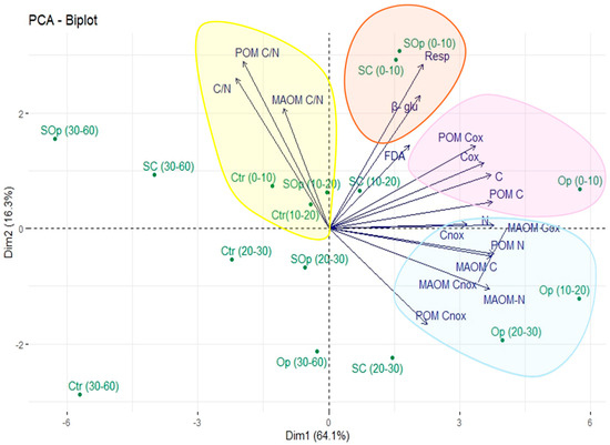 Principal component analysis (PCA) of soil chemical and biological indicators under different open canopy levels (Ctr, Op, SOp, and SC) and soil depths (0–10, 10–20, 20–30, and 30–60 cm). Arrows represent the original variables projected into the space of the first two principal components (Dim1 and Dim2), which explain 80.4% of the total variance, respectively. Colored ellipses group observations according to their similarities, providing information on the relationship between variables under different open canopy levels and depths. Arrows indicate the contribution of each response variable to the variability explained by the principal components, highlighting the differences in parameters under each treatment.